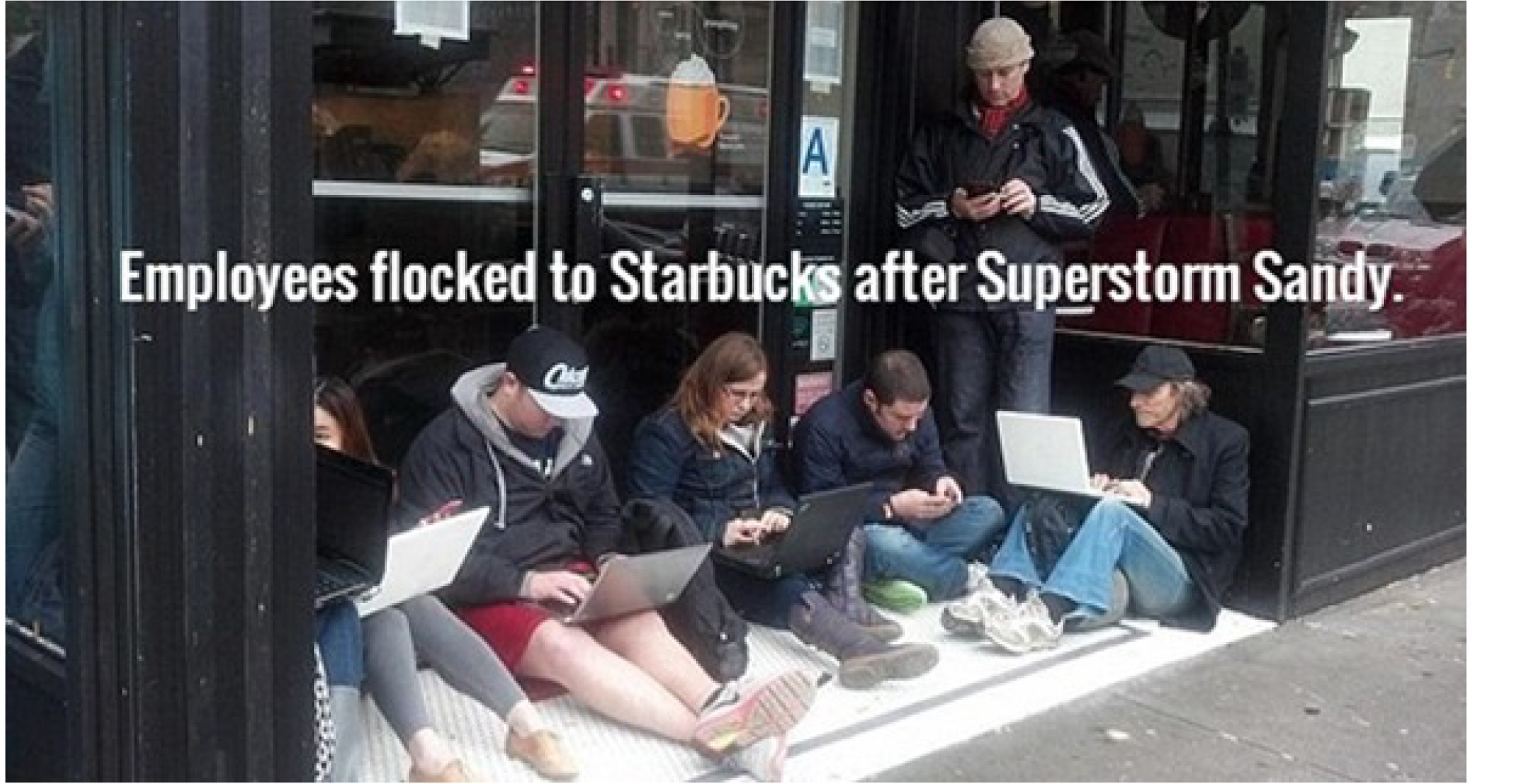Granted, telecommuting can be critical to productivity. However, it is not the solution for all business resumption challenges. While a local crisis may involve a few city blocks or a handful of companies, a regional event, like Hurricane Harvey in Houston, impacts a much larger geography. If your data center is up and running on a hot site, teleworking might be a reasonable option in a single site event. However, for a local or regional disaster, telecommuting may be an issue because there are no government regulations around when internet providers need to provide service after the power goes out. Plus, a severe disaster could damage many employees’ homes or result in widespread power or communications outages as seen in Figure 4: Employees Flock to Starbucks after Superstorm Sandy, where employees crammed into to the nearest Starbucks for internet connectivity.