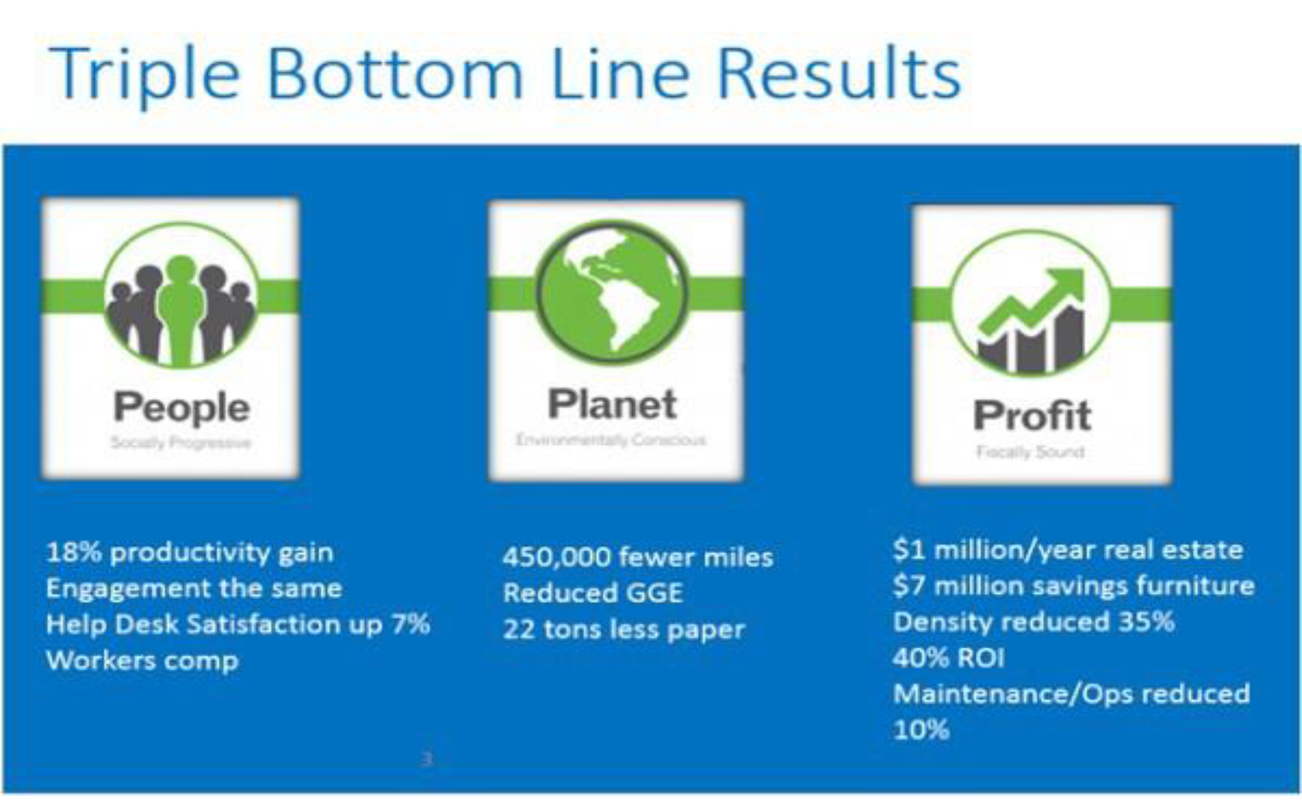 Knowing the CEO’s and CFO’s motivations enabled the workplace team to focus on the triple bottom line: Profit, People and Planet when developing, selling and re-selling the workplace strategy, as shown in Figure 2: Triple Bottom Line Results.