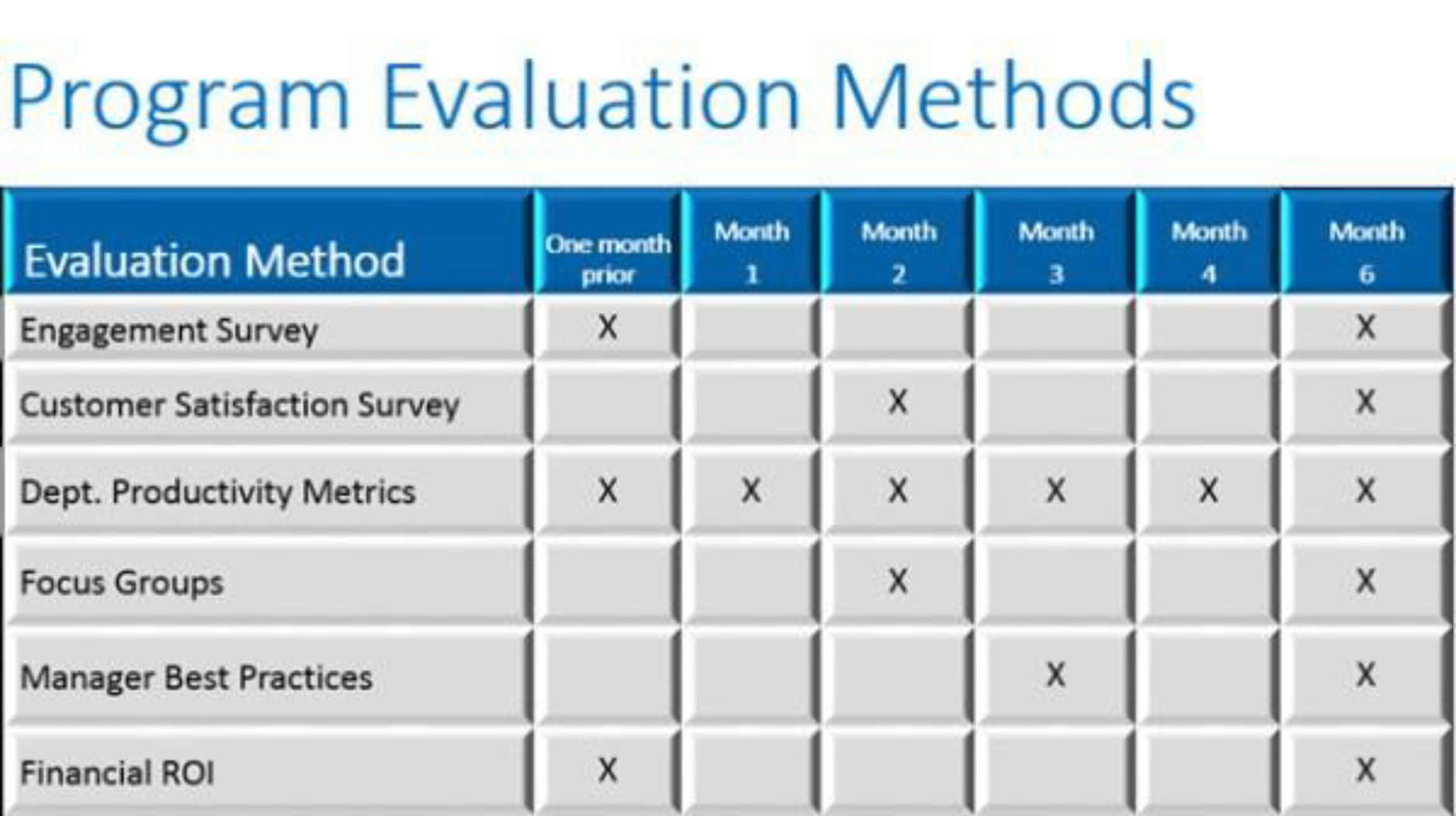 Midway through the workplace project, the C-Suite changed. This of course made employees at SCAN deeply concerned about their work-at-home program and new workplace design. Fortunately, the team updated the mobility program data regularly and could prove that the program was effective and the CEO allowed it to continue. Figure 4: Program Evaluation Methods shows some of the data gathering methods and timing.
